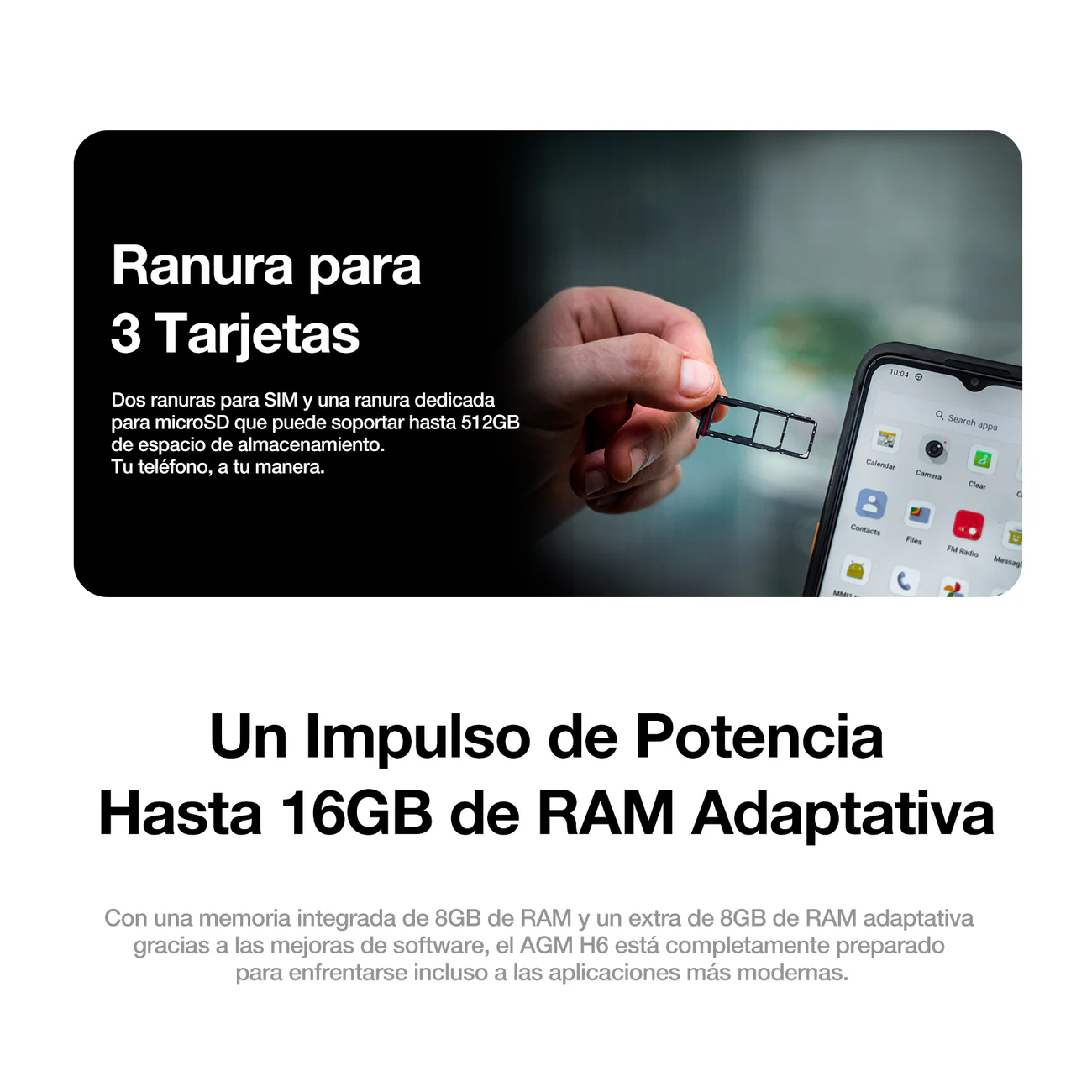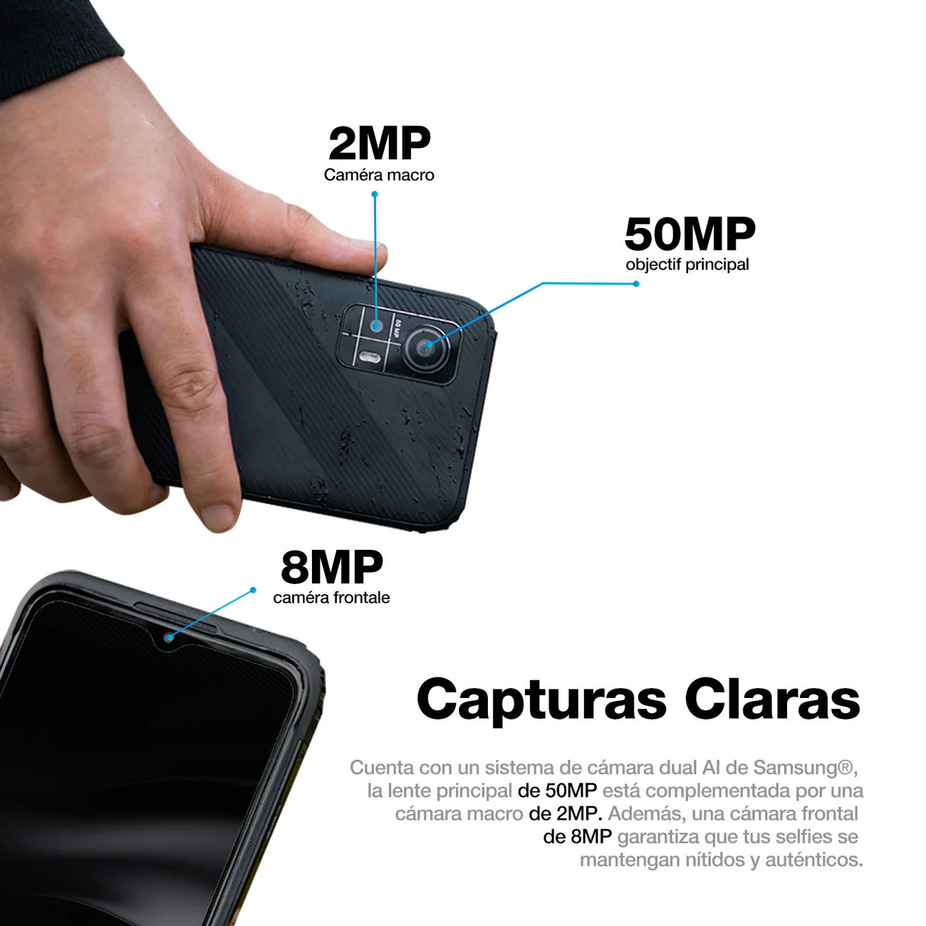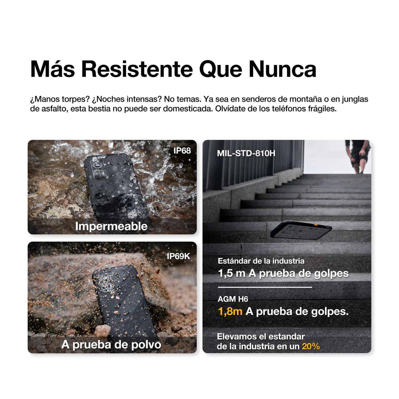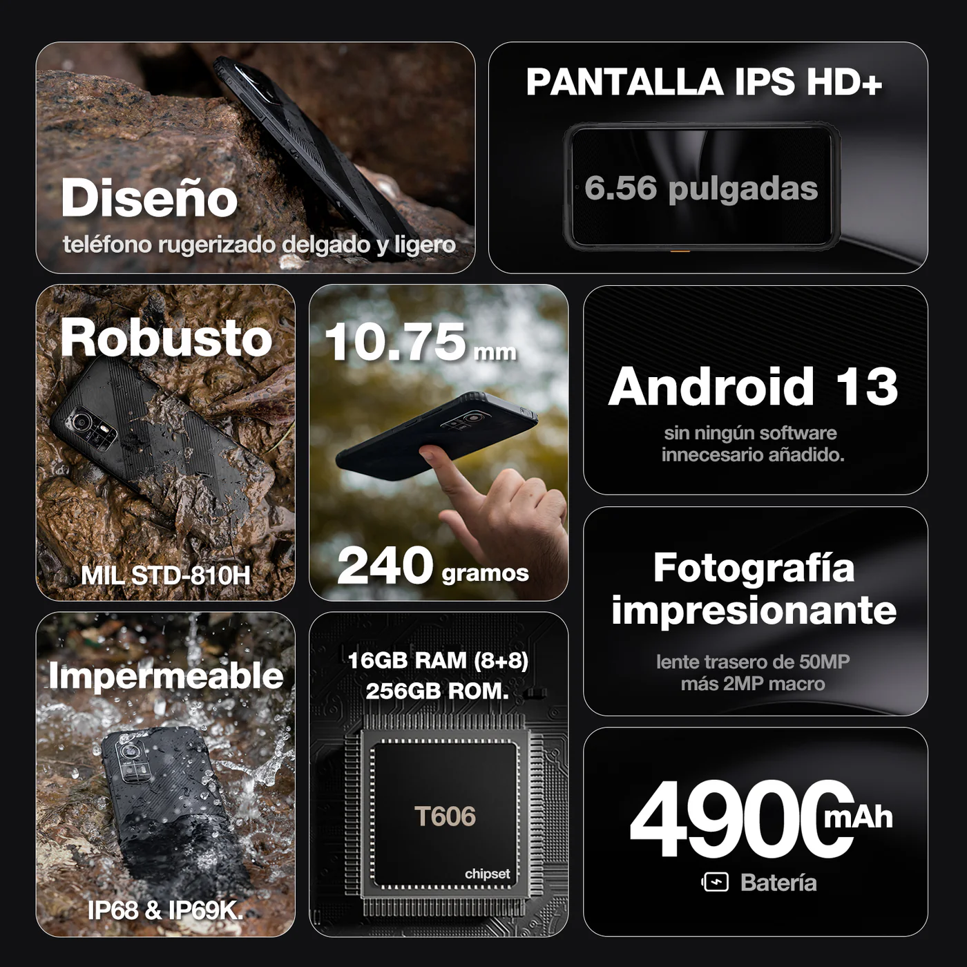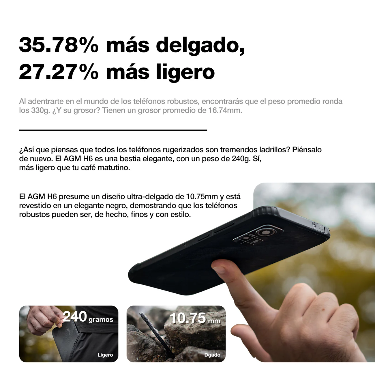 Su cámara principal de 50 MP permite capturar imágenes claras en múltiples entornos, mientras que su certificación IP68 / IP69K / MIL-STD-810H asegura resistencia al agua, polvo, caídas y condiciones extremas. Con un perfil de solo 10,75 mm y peso de 240 g, el AGM H6 es uno de los equipos rugerizados más cómodos de manejar en su categoría.